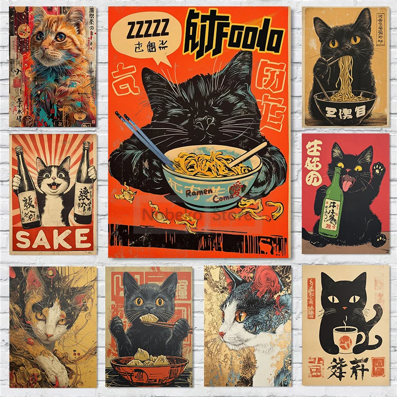 Vintage Japanese Style Cat Poster Funny Ramen Sake Prints Canvas Painting Wall Art Pictures Home Room Vintage Kitchen Decoration