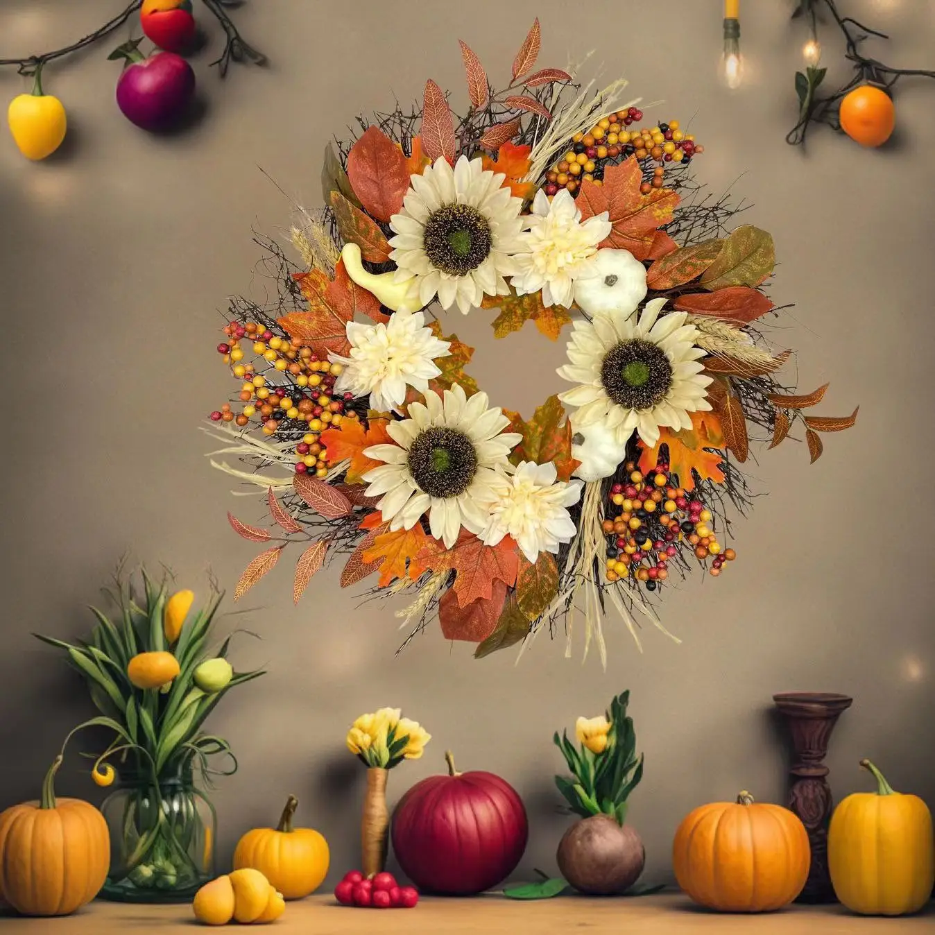 Autumn Thanksgiving White Pumpkin Wreath Harvest Festival Simulation Wreath Sunflower Maple Leaf Wreath Decorative Door