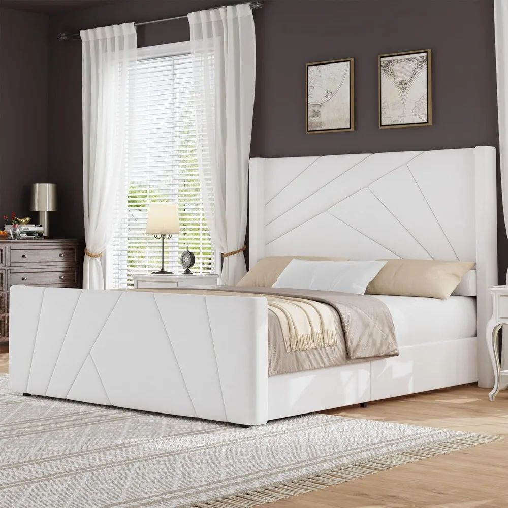 Full Size Bed Frame, Velvet Upholstered Platform Bed with Geometric Tufted Headboard & Footboard, Wingback Design