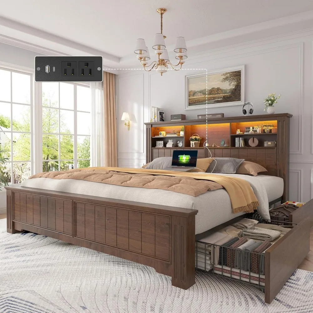 EnHomee Queen Bed Frame with Headboard, Bed Frame Queen Size with 4 Drawers Charging Port & LED, Farmhouse Queen Bed Built in Ch