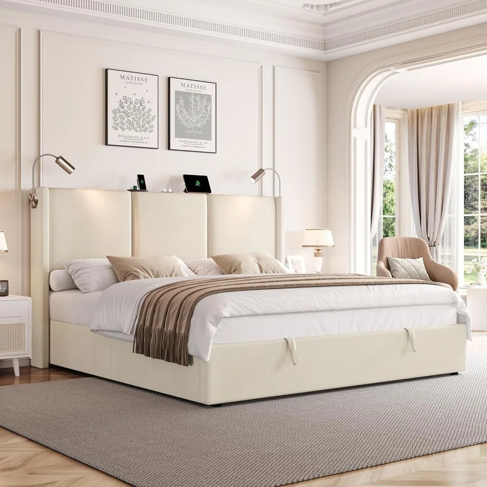 HOSTACK Full Size Lift Up Storage Bed Frame with Charging Station, Modern Upholstered Platform Bed with Reading Light & Adjustab