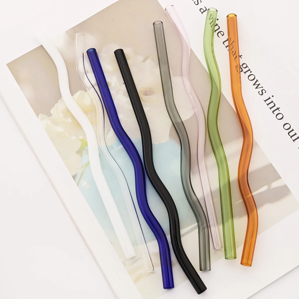 4pcs 200*8mm Glass Straws Wavy Colorful Drinking Straw Set with Brush High Borosilicate Glass Straw Kitchen Party Bar Drinkware