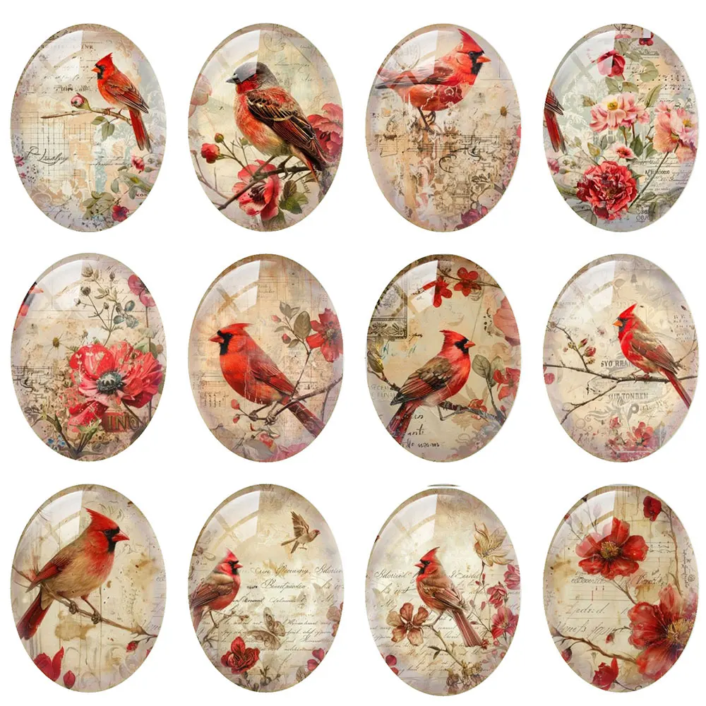 10pcs/lot Retro Red Bird Flower Branch Oval Photo Glass Cabochon Flatback Demo Flat Back Cameo For Diy Jewelry Making Supplies