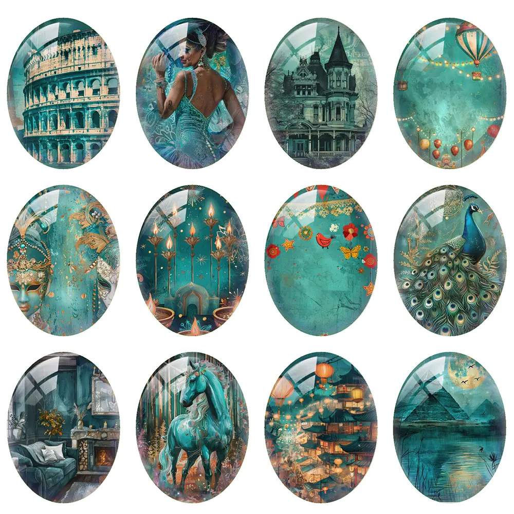 10pcs/lot Blue Green Bird Horse Peacock Oval Photo Glass Cabochon Flatback Demo Flat Back Cameo For Diy Jewelry Making Supplies