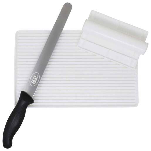 LEM Jerky Knife and Board Kit - With this Jerky Knife and Board Kit, you can cut evenly thin strips of meat for even cooking and marinating. Includes 12in x 12in double-sided plastic board-cut depths are 1/4in and 1/8in with ribbing and nubs to hold...
