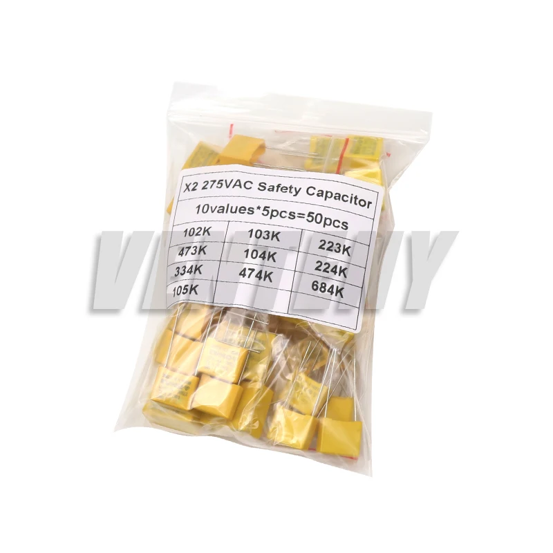 50pcs/Lot Polypropylene Film X2 Safety Capacitor Assorted Kit 275VAC 10Values Each 5pcs 1NF - 1UF