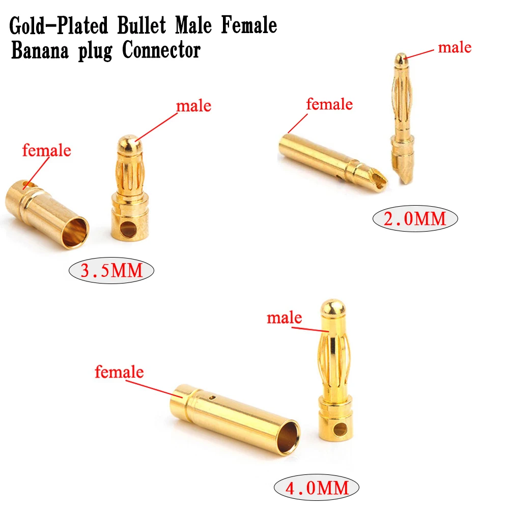 5Pairs Gold Plated Brass 2mm 3mm 3.5mm 4mm 5mm 6mm 8mm Banana Connector Plug Bullet Male Female ESC Lipo RC Battery Plugs  Read more