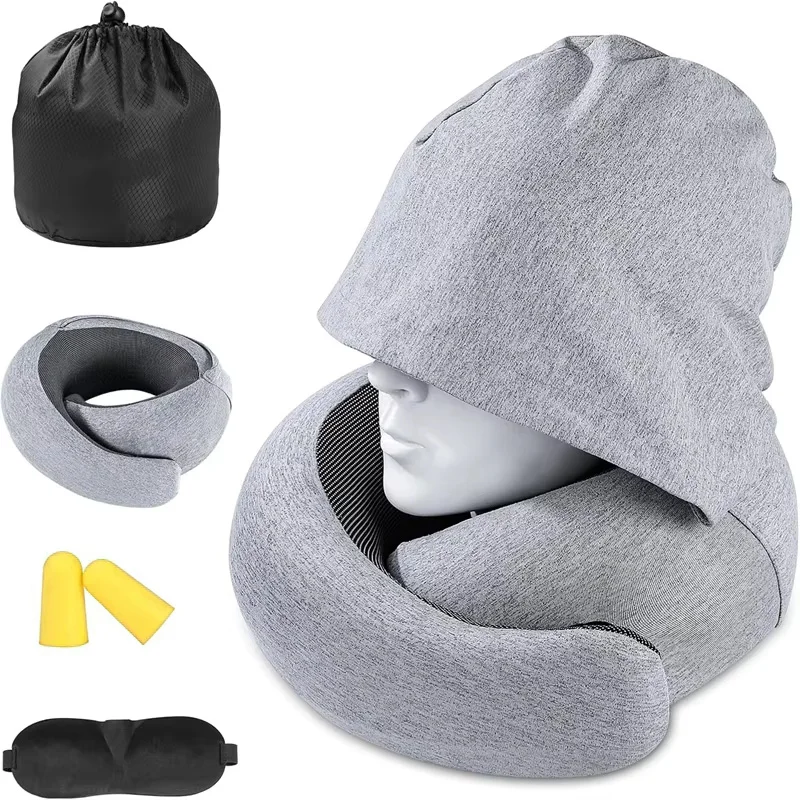 1pcsHooded Travel Neck Pillow Memory Foam For Airplane Office Car Sleeping Long Flight Must Have Road Trip Essentials Light Gray  Read more