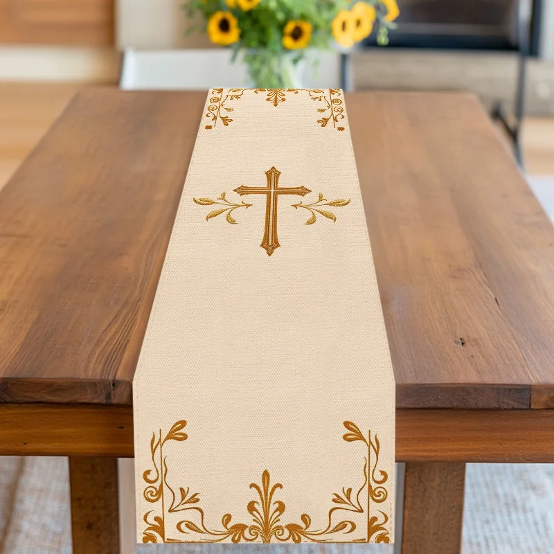 Bohemian style elegant golden cross table runner with gorgeous flowers Christian theme fabric suitable for Easter and church dec