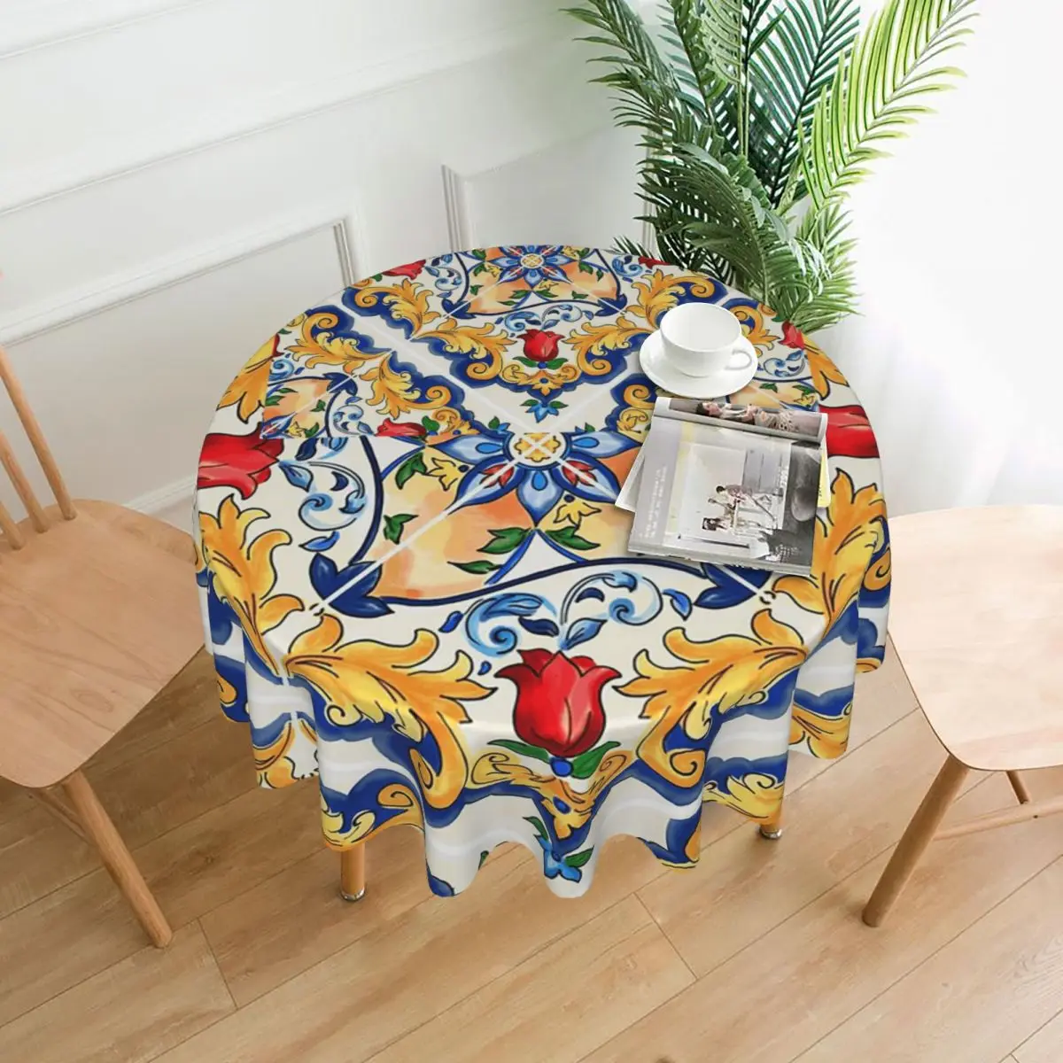 Sicilian Majolica Colourful Floral Flourishes Tile Waterproof Round Tablecloth Oilproof Table Cloth for Kitchen Table Cover