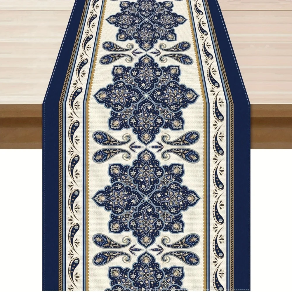 1pc, Boho Bohemia Style Blue Flowers Table Runner Burlap Table Decoration for Home Kitchen Dining