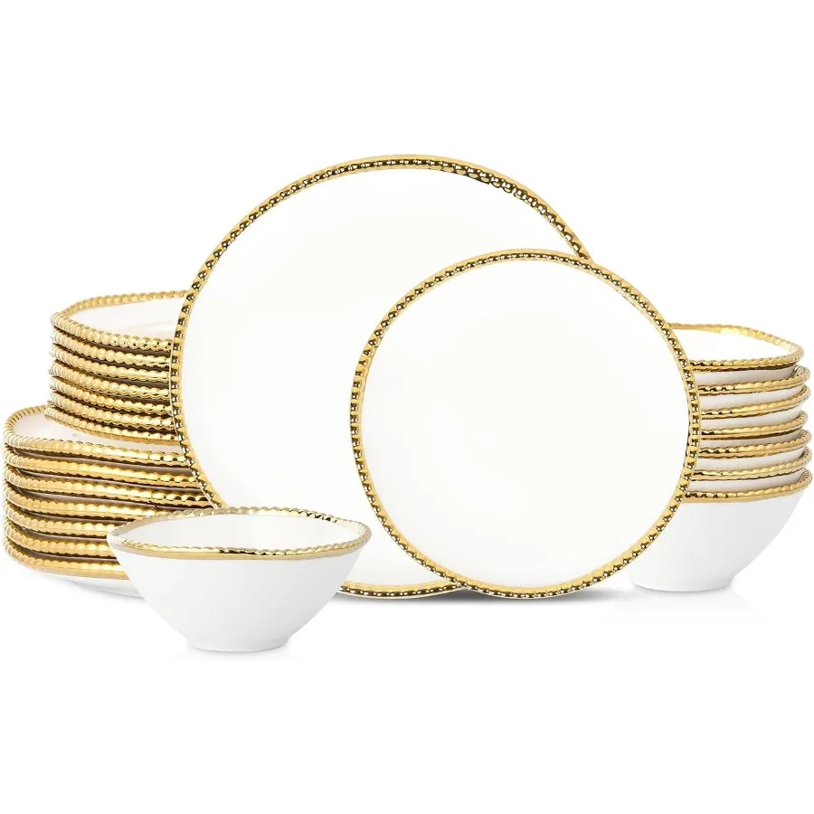 Christian Siriano Akoya Porcelain Dinnerware Set 24Piece Dish Set for 8 Plates and Bowls Set White and Gold