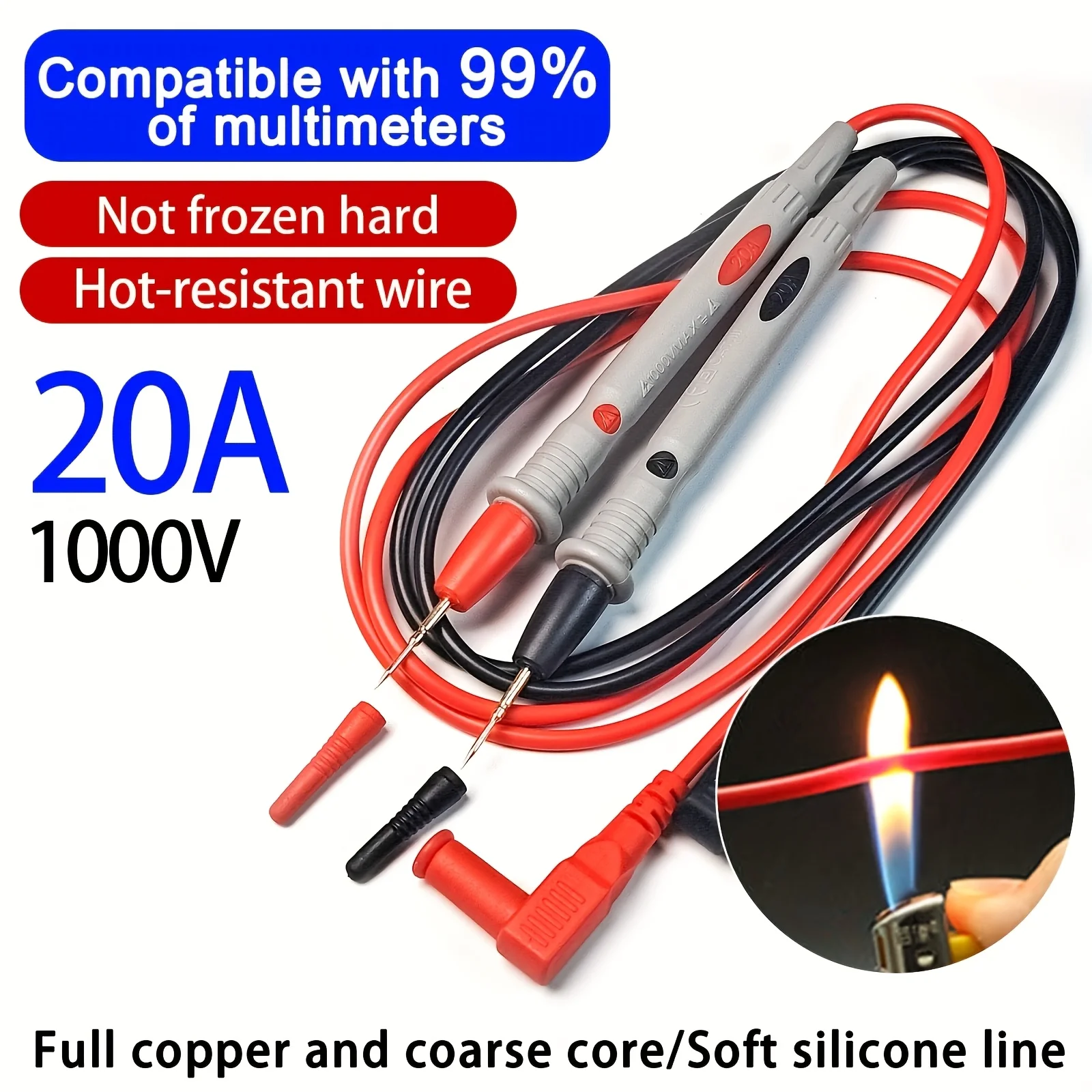 1 Pair Red silicone multimeter test cable set, 20A 1000V electrical probe cable, compatible with 99% multimeter