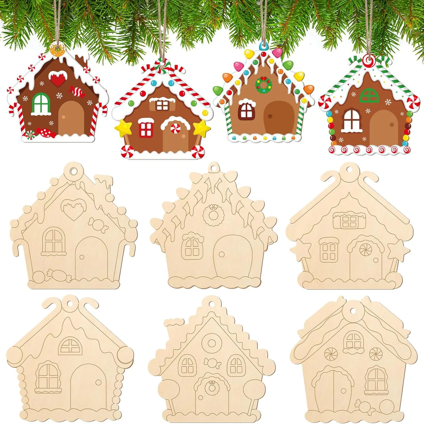 6Sets Wooden Christmas Ornaments Unfinished Wood Crafts Painting DIY Paintable Christmas Cutouts Slices for Craft with Ropes