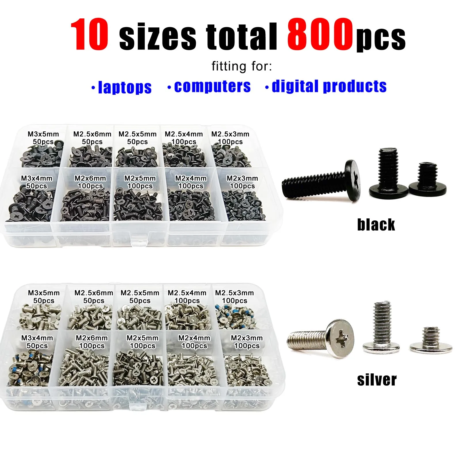 800pcs/box Laptop Computer Screw Bolt M2 M2.5 M3 Phillips Cross Ultra Thin Flat Wafer Head Mix Assortment Kit Set Steel