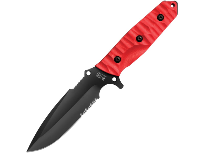 TB Outdoor Survival Fixed Blade Knife 9.75in Overall 4.5in Black PVD Partially Serrated MOX Steel Blade Red Sculpted G10 Handle Kydex Sheath 11060010. Full tang. Glass breaker. Lanyard hole. Black Kydex MOLLE compatible belt sheath. Storage case....  Read more