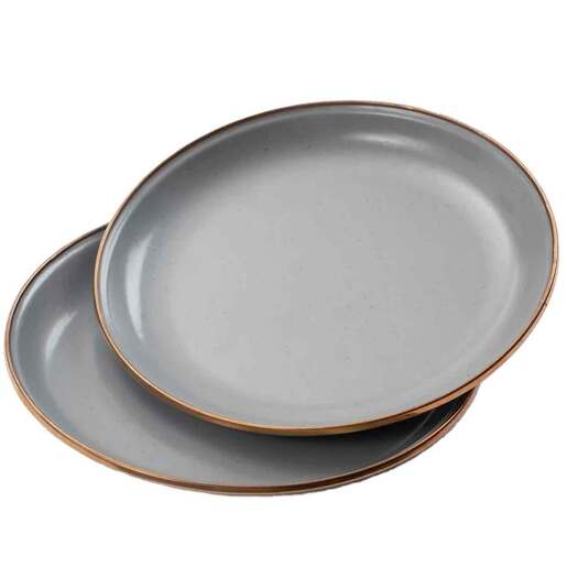 Barebones Enamel Deep Plate Set - Each item features a speckled enameled surface with hand-finished baked stainless steel trim creating a bronze-like patina finish, resulting in unique pieces that form a cohesive set. Hand wash only. Do not...