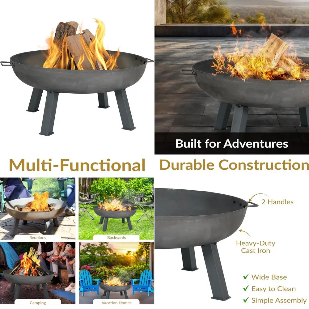 34-Inch Outdoor Cast Iron Fire Pit Bowl - Heavy-Duty Wood Burning with Steel Finish and Handles