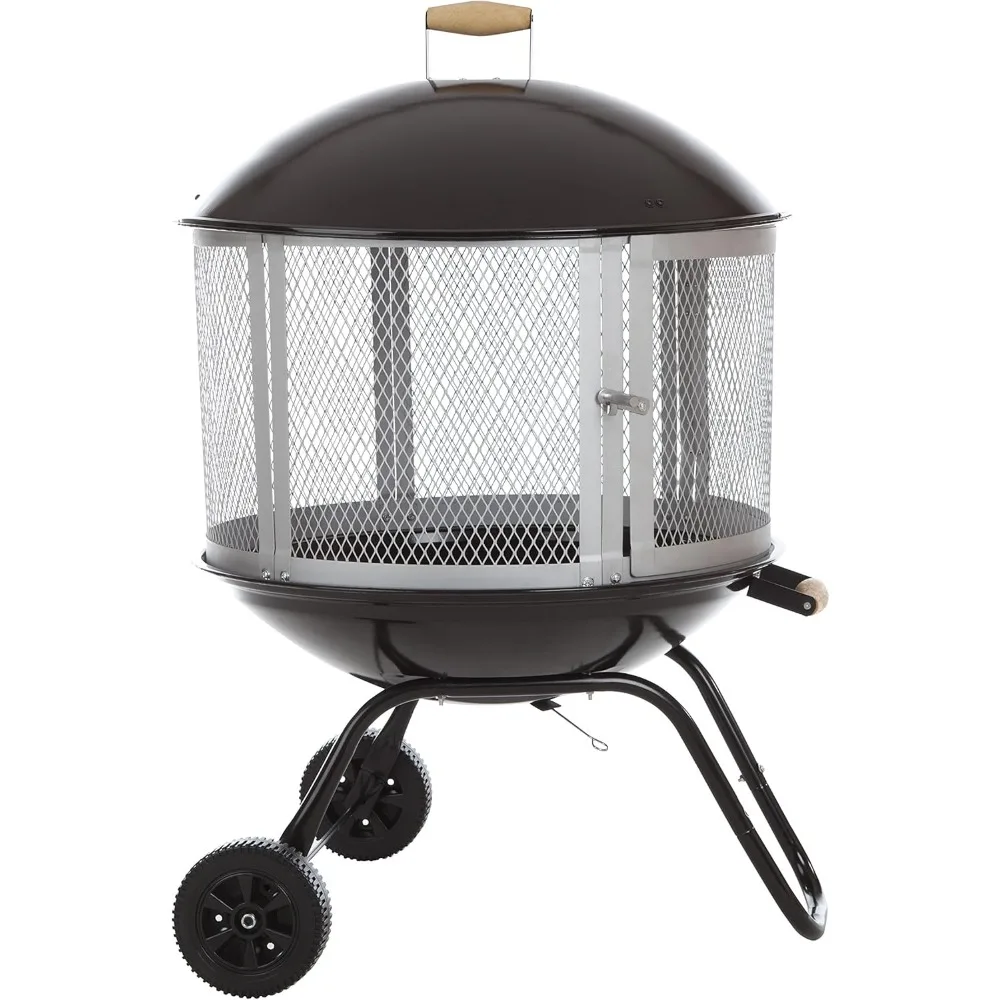 Portable Bessemer Style Fire Pit with Wooden Bonfire, Porcelain Enamel, Wheels, and Handle for Outdoor Fireplace Use