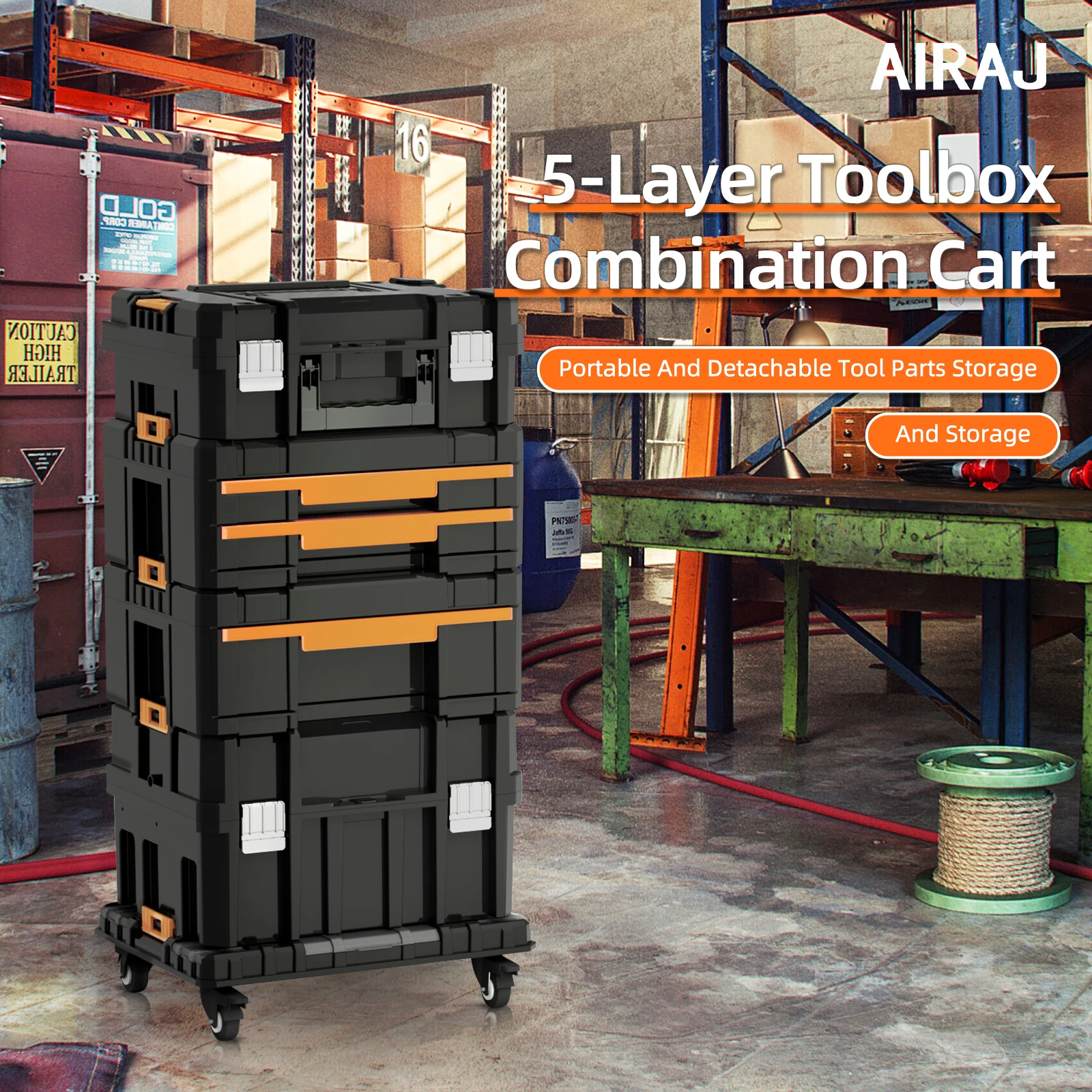 AIRAJ 5Pcs Multifunctional Super Stacked Heavy-duty Plastic Tool Box with Wheels Wear-resistant Tool Storage and Organizing Set