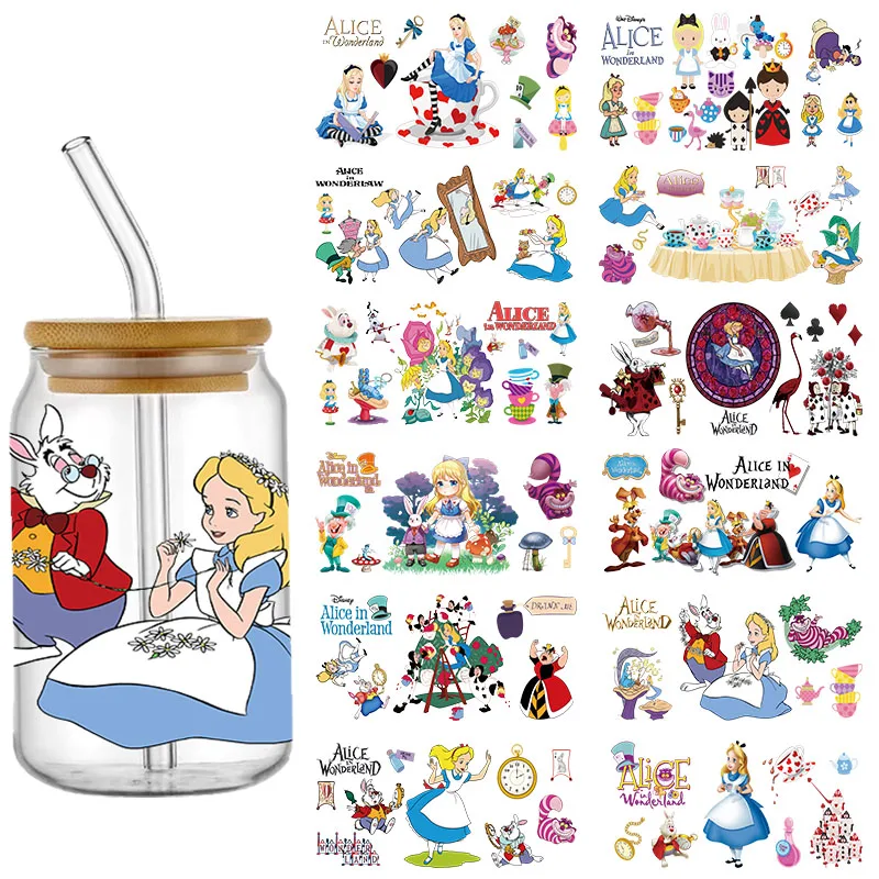 Alice in Wonderland Disney Princess UV DTF Transfer Sticker Cartoon Cup Wrap For 16OZ Glass Tumbler Can Bottle Waterproof Decal