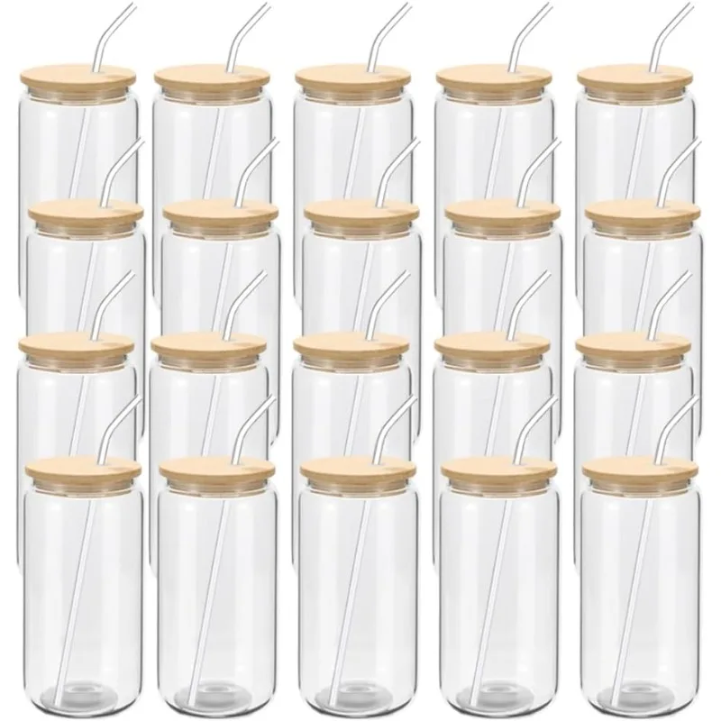 20 Pack Glass Cups with Bamboo Lids and Glass Straw 16oz Beer Can Shaped Drinking Glasses Cups, Glass Tumbler Reusable Cute Cups