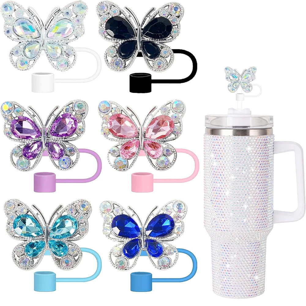 6pcs Shiny Straw Toppers, Colorful Diamond Butterfly Straw Covers Cap for Stanley Tumbler Cups 30&40oz Tumbler with Handle
