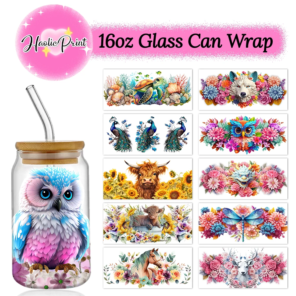 Animal UV DTF 16oz Libbey Glass Can Wrap Flower Butterfly Glass Dragonfly Libbey Wrap Cute Turtle Frosted Glass Tumbler Wrap