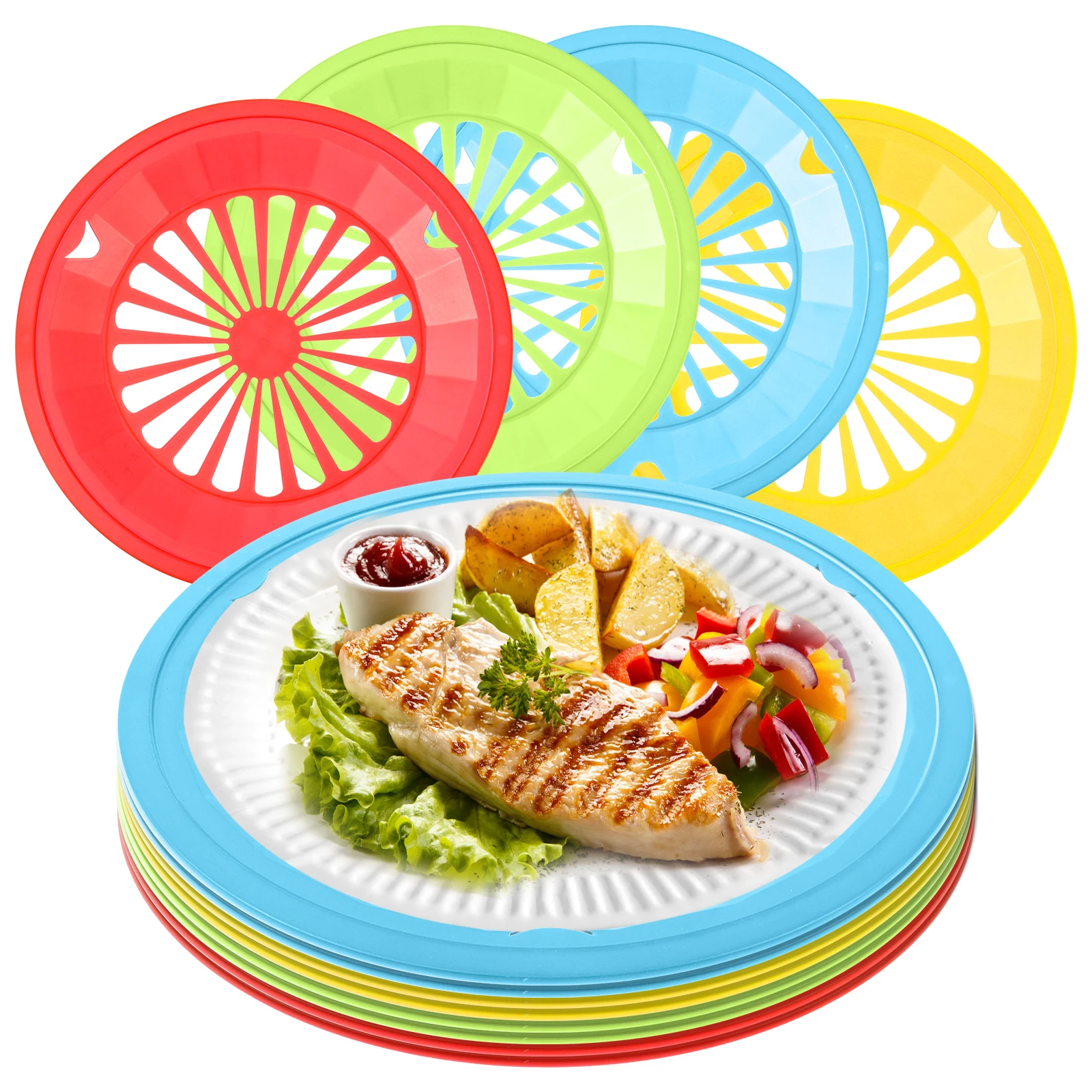 12 Pcs Paper Plate Holders 10 Inch Reusable Plastic Round Paper Plate Dispenser with Snap in Grooves 4 Bright Colors for Party