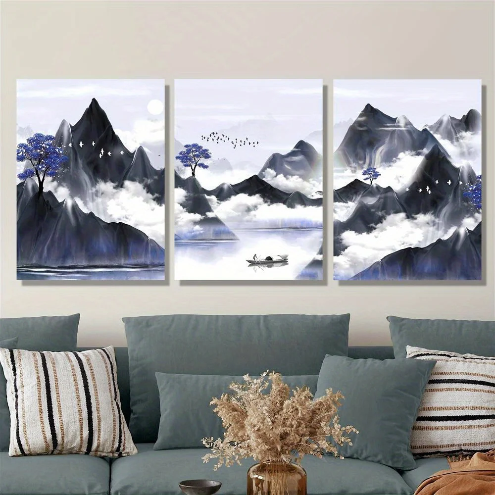 2D Flat, 3pcs wood framed canvas print art, Calm watercolor style landscape painting, mountains, mist, river, sailboat poster, S