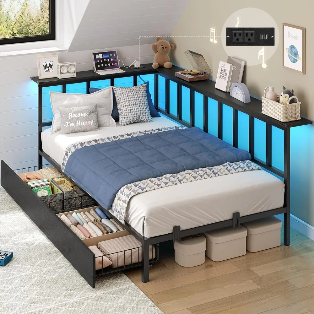Corner Twin Bed Frame with 2 Storage Drawers and Charging Station, Metal Twin Size Platform Bed Frame with Storage Shelves