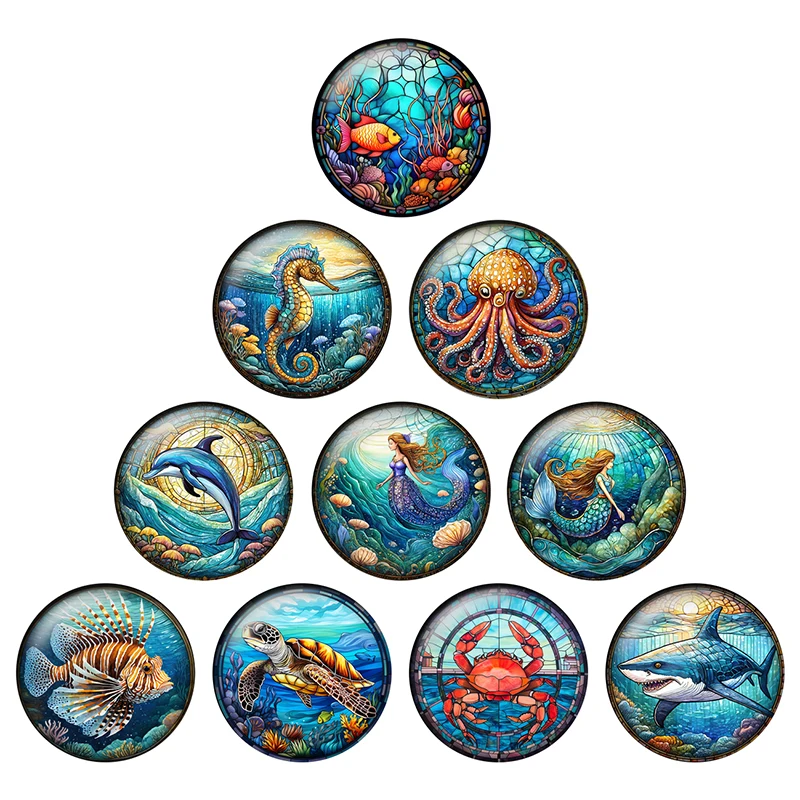 24pcs/lot Sea Animals Fish Seahorse Tortoise Dolphin 8mm/25mm Round Photo Glass Cabochon Demo Flat Back Making Findings H146