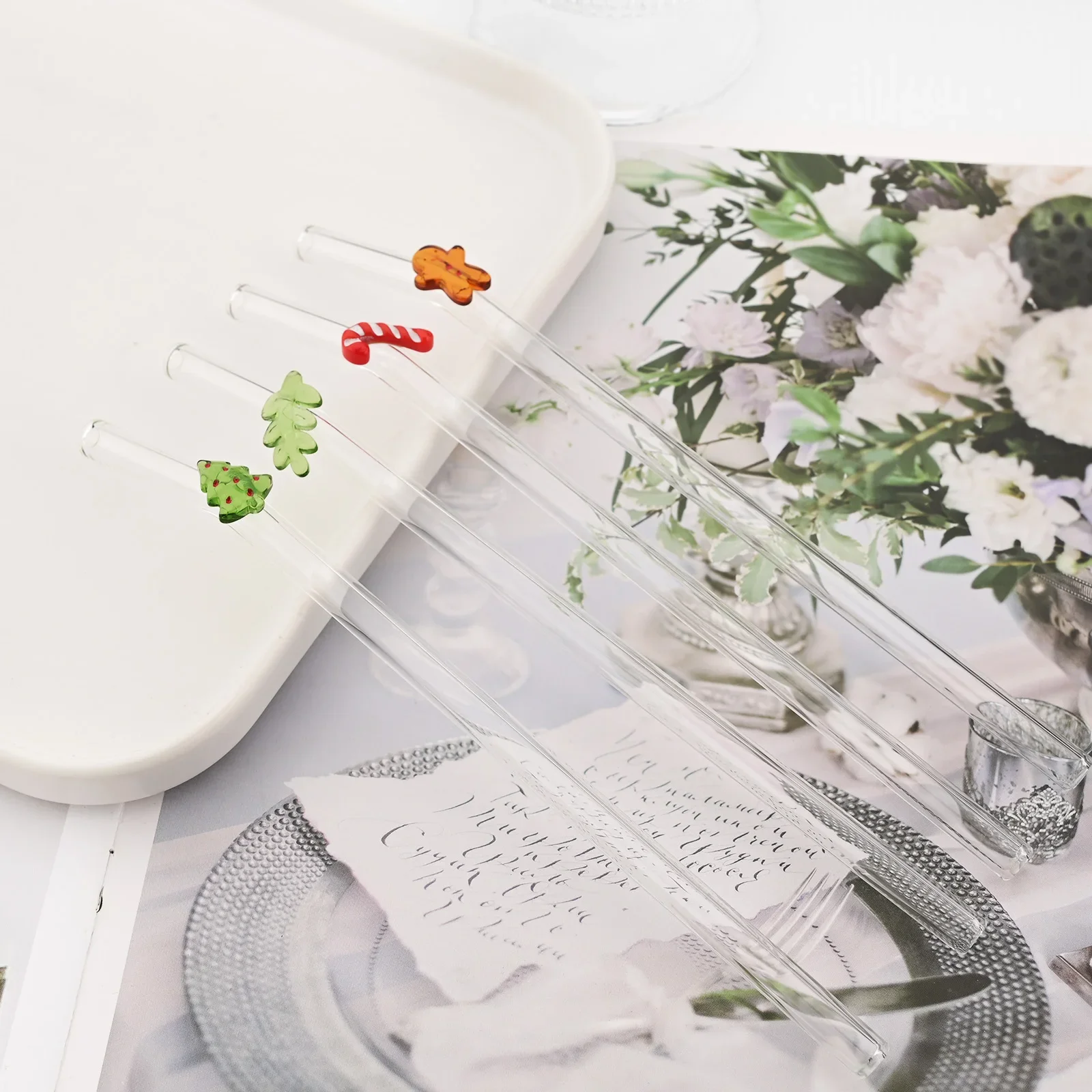 4pcs Christmas Glass Straw Milk Tea Juice Cocktail Straw with Brush High Borosilicate Glass Straw Set Kitchen Bar Accessories