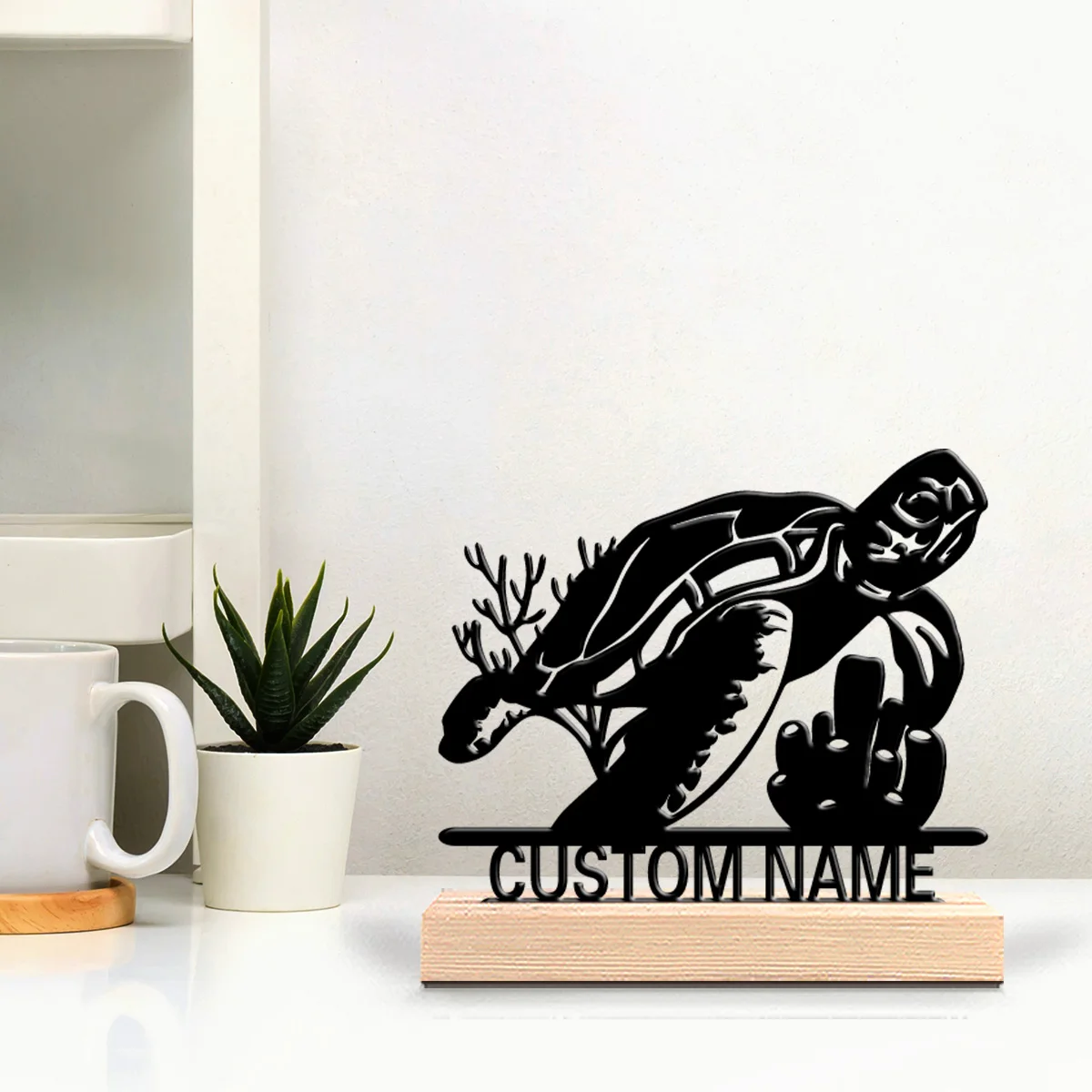 1pc Romantic Personalized Custom Sea turtle Metal Statues Ocean-Inspired Desk Art with Wooden Base, Ideal for Beach Houses, Zen