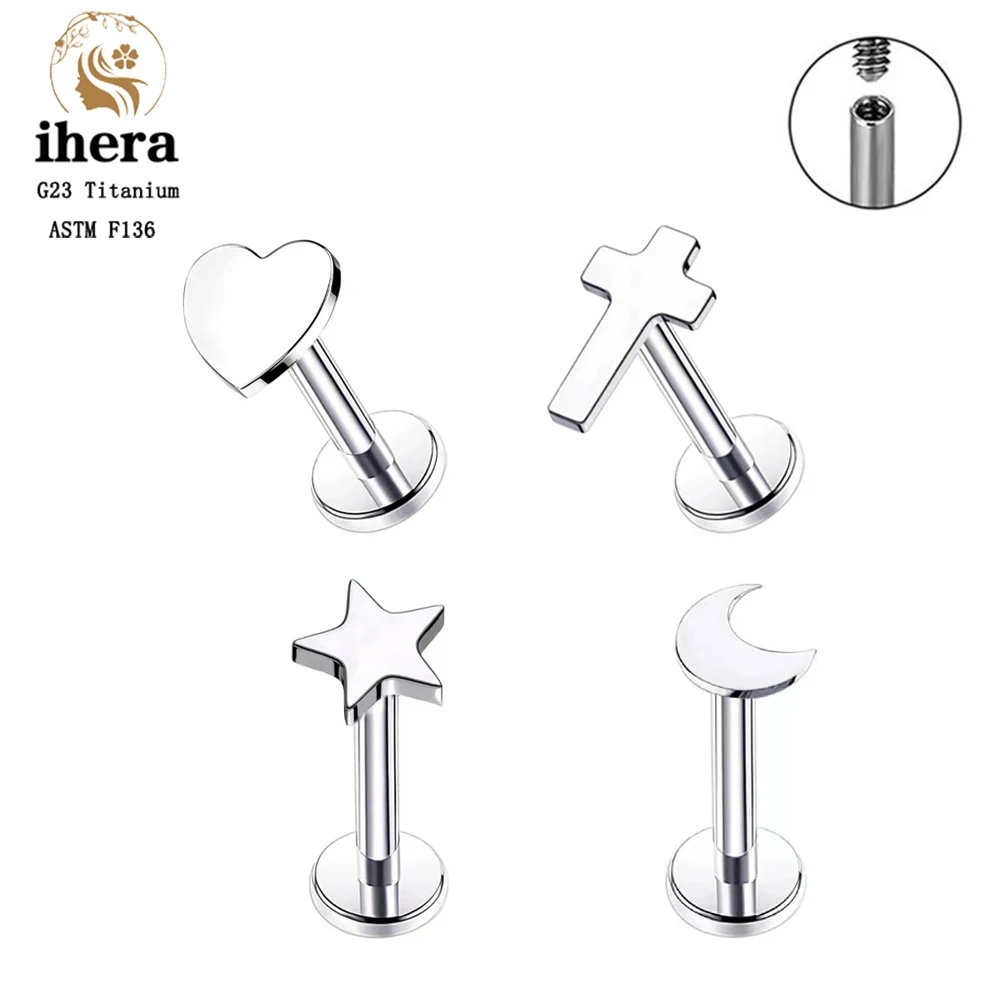 G23 Titanium Silver Color Heart Studs Earrings ASTM F136 Nose Studs Flat Star Top Lip Ring Ear Tragus Cartilage Piercing Jewelry