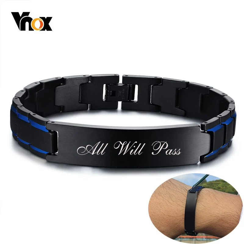 Vnox Men Personalized Custom Engrave ID Bracelets Black and Blue Color Stainless Steel Link Chain 8.46"