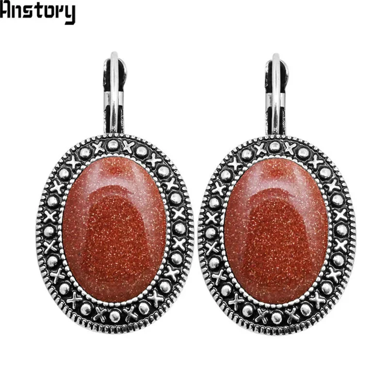 Oval Sequins Golden Stone Earrings For Women Antique Silver Plated Fashion Hook Earring