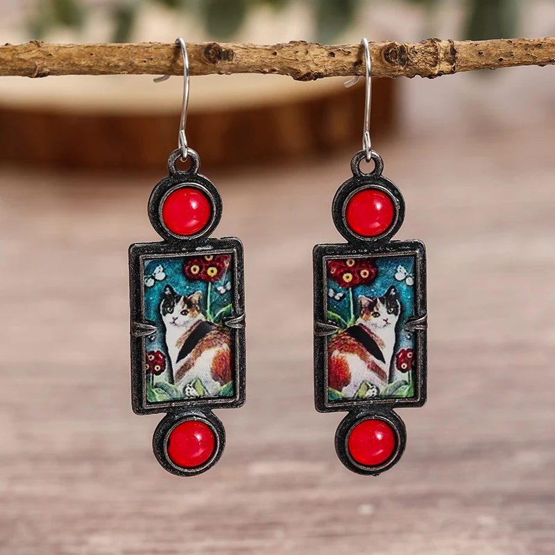2023 New Vintage Cute Cat Earrings Animal Jewelry Red Stone Antique Metal Geometric Drop Earrings for Women Girls Accessories