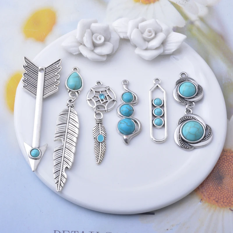 10pcs Antique Silver Color Alloy Imitation turquoise stone Long Earrings feather Dream catcher Charms Jewelry sword Pendants