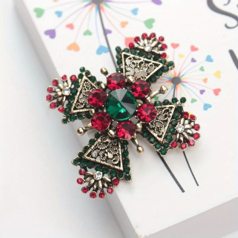 Vintage Style Red & Green Crystal Maltese Cross Brooch / Pendant Shawl Pin