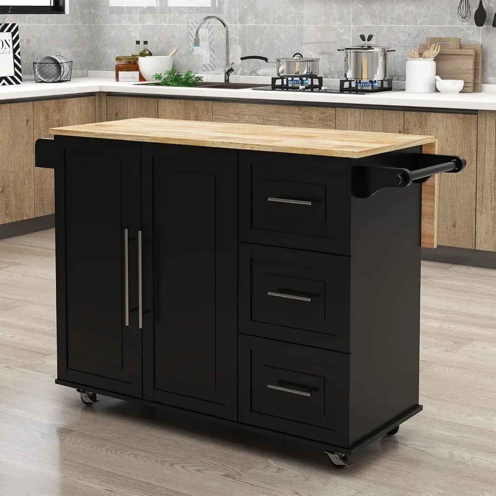 Kitchen Island Cart on Wheels Drop-Leaf Rubber Wood Top Kitchen Cart with Storage Cabinet and Drawers Kitchen Trolley with