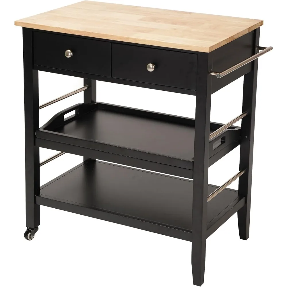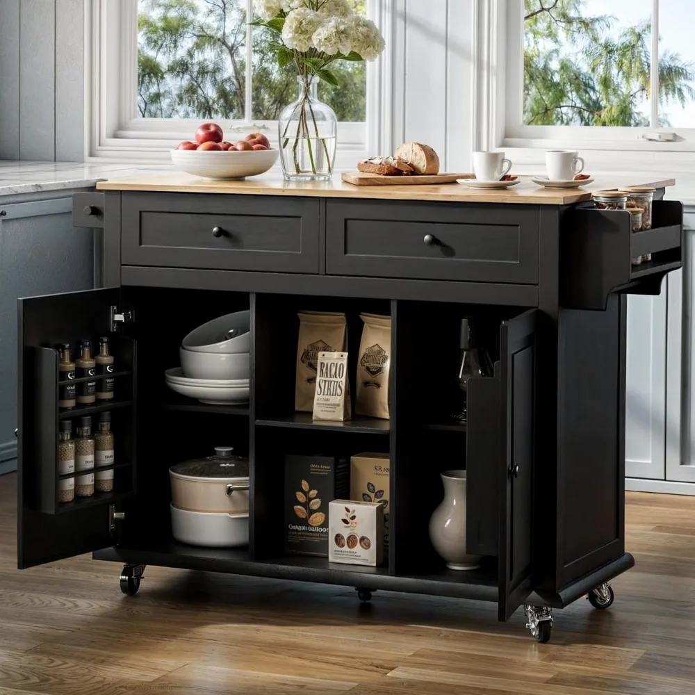 Rolling Kitchen Island Cart, Black Kitchen Cart with Rubberwood Top, Ample Storage Drawers, Adjustable Shelves, Utility Cart