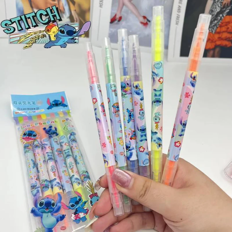 6pcs/set Kawaii Stitch Double Ended Highlighter Children's Drawing Graffiti Markers Students Supplies Stationery Holiday Gifts