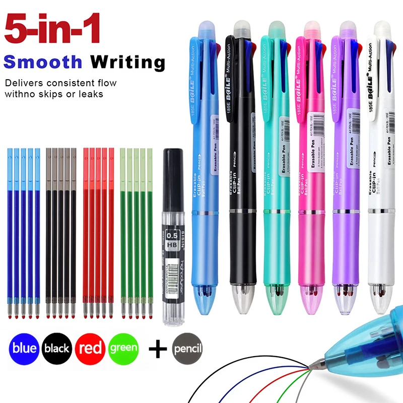 5 In 1 Multicolor Erasable Gel Pens Set with 0.7mm Refills and 0.5mm Automatic Pencil Lead, Office School Writing Ballpoint Pen