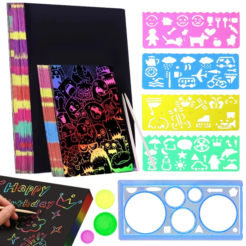 50 pcs Scratch Paper Kids Rainbow Magic Scratch Off Paper Sheets Art Craft Kit Black Note Paper Drawing Pads with Stencils  Read more