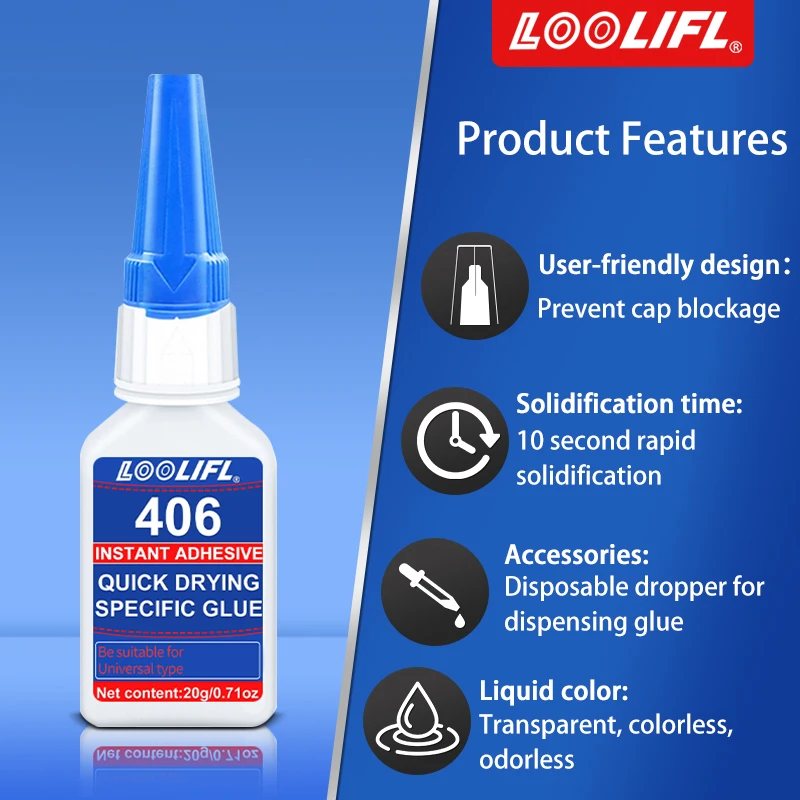 LOOLIFL 406 Super Glue Plastic Professional Adhesive Transparent Cyanoacrylate Glue Fast Drying Odorless Long Lasting Bonding