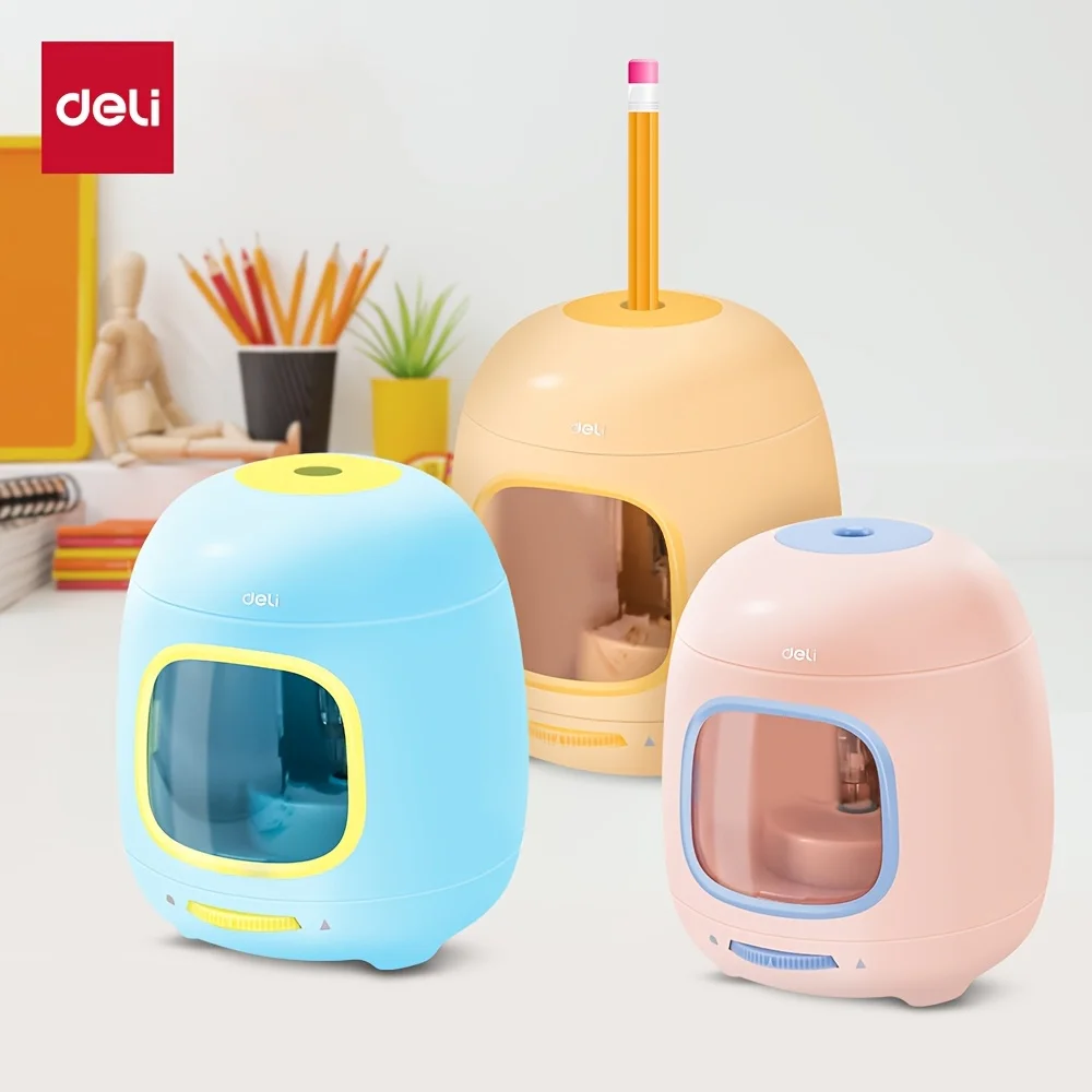 Deli Electric Pencil Sharpener, Efficient and Portable Sharpening Tool for Home, School, and Office Use, Blue, Pink, Yellow