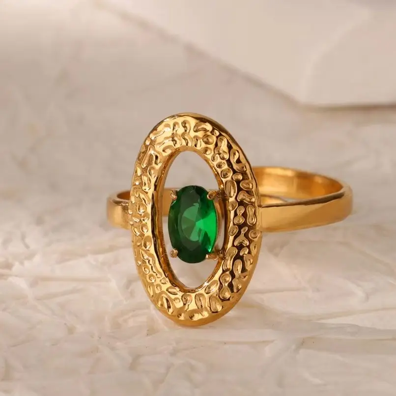Zircon Green Oval Rings For Women Gold Color Stainless Steel Hollow Oval Geometric Ring Christmas Wedding Party Jewelry Gift