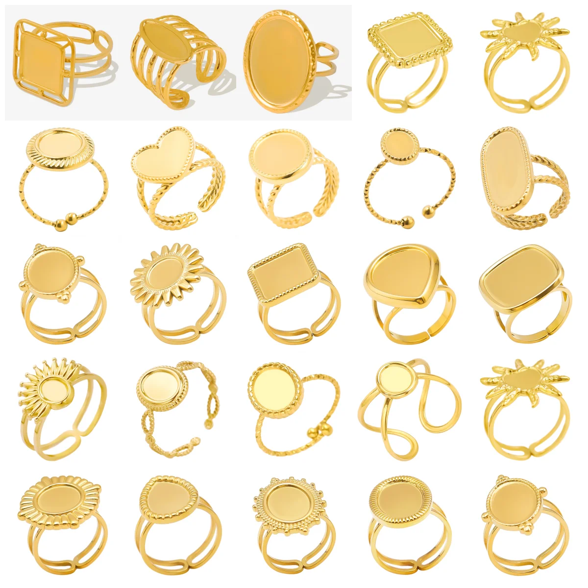 6pcs Fashion Classic Stainless Steel Ring Real Gold Plated Oval/Peach Heart/Sunflower/Square Blank Base Rings Wedding Gift