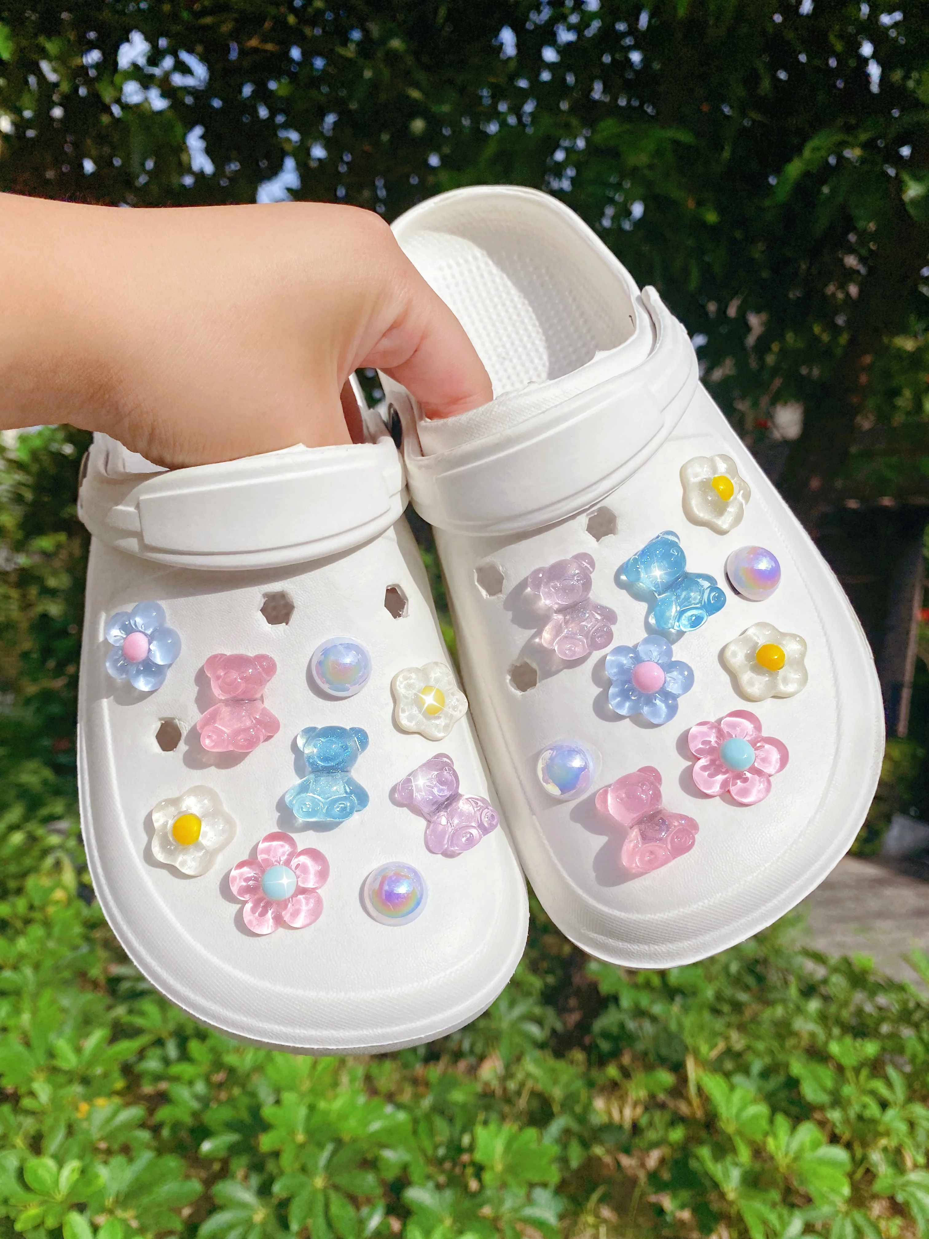 18 pieces of pink flash bear, flower, purple flash bear, blue flash bear, ABS pearl shoe buckle DIY decoration, suitable for wom
